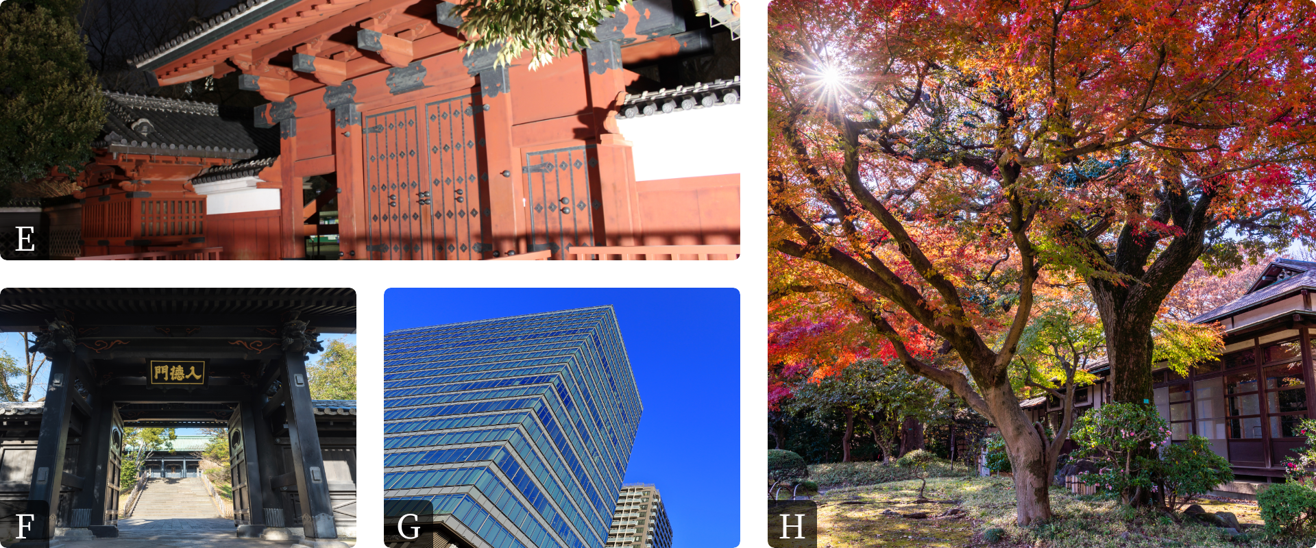 E.東京大学 徒歩9分/約650m F.湯島聖堂 徒歩11分/約850m G.文京ガーデン 徒歩14分/約1.1km H.小石川後楽園 徒歩14分/約1.1km